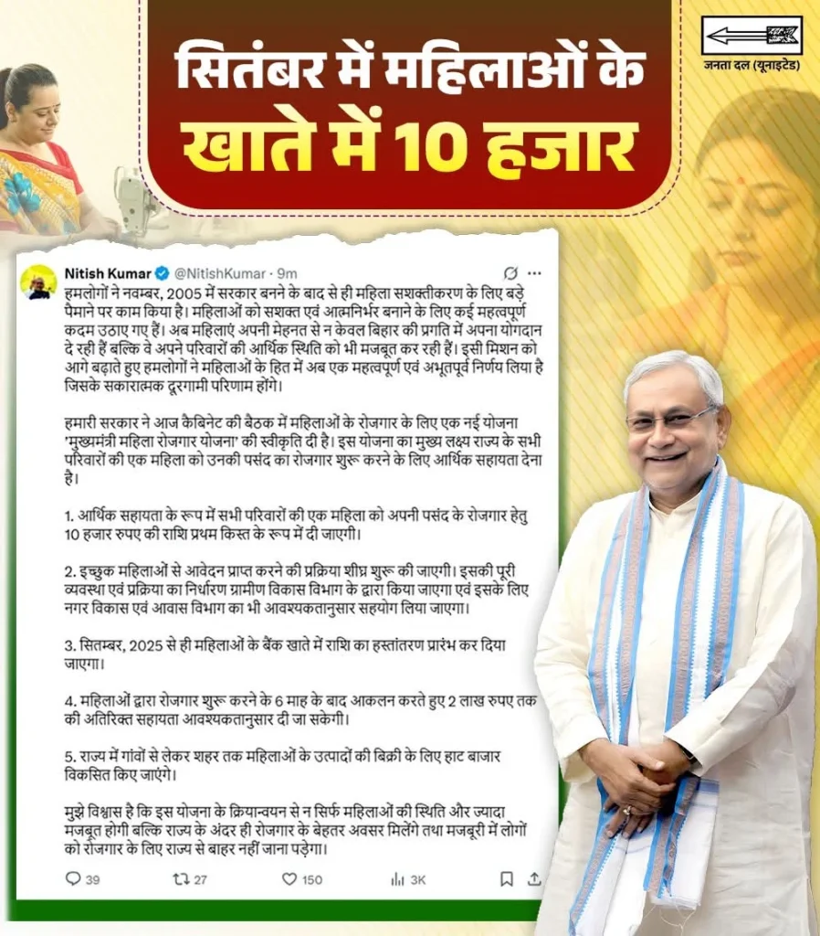 Bihar Mukhyamantri Mahila Rojgar Yojana 2025: CM Nitish Kumar का बड़ा ऐलान महिलाओं को ₹10,000 की पहली किस्त, रोजगार शुरू करने का शानदार मौका!