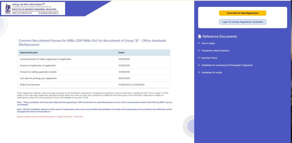 - ऑनलाइन अप्लाई ऑप्शन चुनें: होमपेज पर “Apply Online for Common Recruitment Process under CRP-RRBs-XIV” या इसी तरह का लिंक मिलेगा। उस पर क्लिक करें। (नोट: 2025 के लिए CRP-RRBs-XIV अपडेट हो सकता है, साइट चेक करें।)