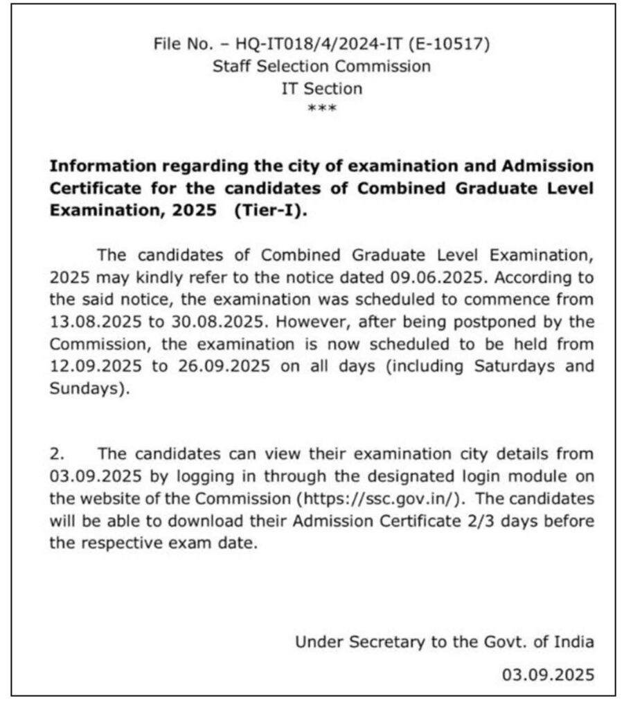 यह एक प्रारंभिक नोटिफिकेशन है जो SSC जारी करता है, जिसमें आपकी परीक्षा सिटी और केंद्र की जानकारी होती है। इससे आपको पहले से प्लानिंग करने में मदद मिलती है, लेकिन यह पूरा एडमिट कार्ड नहीं है। - SSC CGL Tier-I Admit Card 2025 कब जारी होगा?