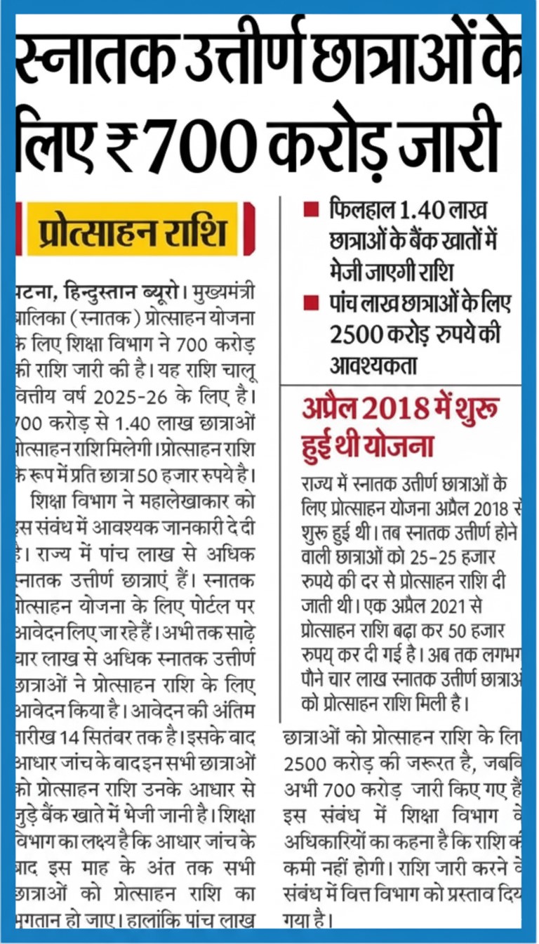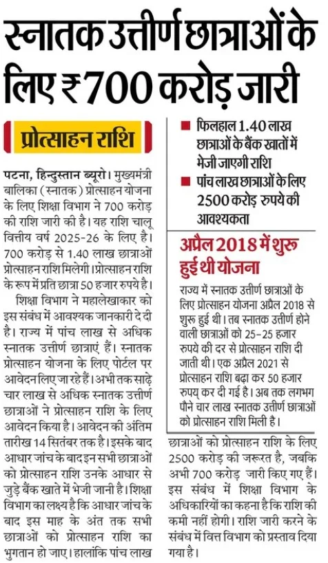 आपकी जानकारी के लिए बता दें कि बिहार स्नातक पास स्कॉलरशिप 2025 के तहत मिलने वाली 50,000 रुपये की राशि अक्टूबर महीने तक आपके बैंक खाते में आ सकती है। सरकार ने इस योजना के लिए 700 करोड़ रुपये जारी कर दिए हैं, जिसकी वजह से शुरुआती चरण में लगभग 1.40 लाख छात्राओं को यह लाभ मिलेगा। जैसे-जैसे विभाग को अतिरिक्त फंड मिलेगा, बाकी योग्य उम्मीदवारों को भी यह राशि ट्रांसफर की जाएगी। अगर आप इस स्कॉलरशिप के लिए आवेदन कर चुकी हैं, तो अपने बैंक अकाउंट और आवेदन स्टेटस को चेक करते रहें, ताकि कोई अपडेट मिस न हो।