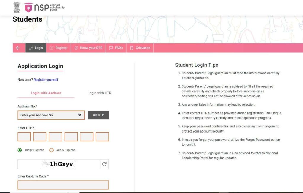- मिले हुए OTR नंबर और अपना पासवर्ड डालकर NSP Portal में लॉगिन करें