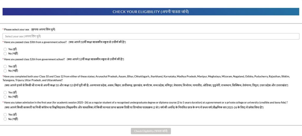 अब खुलने वाले नए पेज पर अपनी योग्यता की जांच करें और “Check Eligibility (पात्रता जांचे)” बटन पर क्लिक करें।