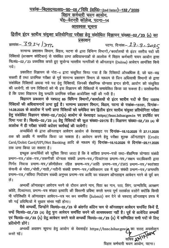 BSSC Inter Level Vacancy 2025: (Re-Open)अगर आप 12वीं पास हैं और Bihar में सरकारी नौकरी की तलाश कर रहे हैं तो आपके लिए शानदार मौका है। Bihar Staff Selection Commission (BSSC) ने Inter Level Vacancy 2025 (Advt. 02/2023) को Re-Open करते हुए 23,175 पदों पर बम्पर भर्ती का नोटिफिकेशन जारी किया है। इच्छुक व योग्य युवक–युवतियां 15 अक्टूबर 2025 से BSSC Inter Level Vacancy 2025 के लिए Online Application कर सकते हैं। आवेदन की अंतिम तिथि 27 नवम्बर 2025 है।