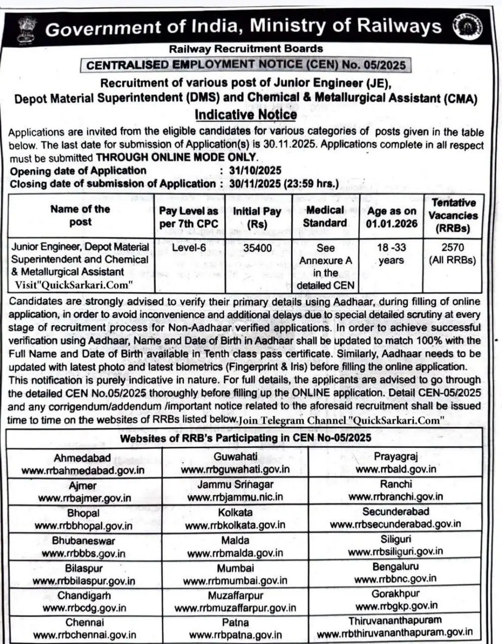 RRB JE Recruitment 2025: अगर आप भारतीय रेलवे में जूनियर इंजीनियर, डिपोर्ट मटेरियल सुपरीटेंडेंट या केमिकल एवं मेटलर्जिकल असिस्टेंट के पद पर सरकारी नौकरी पाना चाहते हैं, तो आपके लिए खुशखबरी है। रेलवे रिक्रूटमेंट बोर्ड (RRB) ने इस साल कुल 2570 पदों पर भर्ती हेतु नोटिफिकेशन जारी कर दिया है। इच्छुक उम्मीदवार 31 अक्टूबर 2025 से 30 नवंबर 2025 तक ऑनलाइन आवेदन कर सकते हैं।
