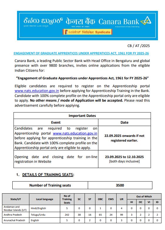 Canara Bank Apprentice Vacancy 2025: क्या आप Canara Bank में Graduate Apprentice के तौर पर सरकारी नौकरी पाना चाहते हैं? कैनरा बैंक ने 2025 में 3500 ग्रेजुएट अप्रेंटिस पदों पर बिना परीक्षा सीधी भर्ती का नोटिफिकेशन जारी किया है। इस भर्ती में 23 सितम्बर 2025 से आवेदन शुरू हो चुके हैं, और सभी योग्य उम्मीदवार 12 अक्टूबर 2025 तक ऑनलाइन आवेदन कर सकते हैं।