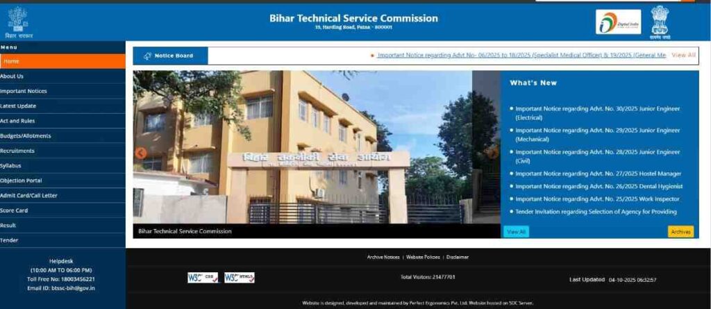 Bihar BTSC Recruitment 2025 अगर आप Junior Engineer, Hostel Manager, Dental Hygienist या Work Inspector जैसी सरकारी नौकरी की तलाश में हैं, तो आपके लिए खुशखबरी है! बिहार तकनीकी सेवा आयोग ने 4 अक्टूबर 2025 को कुल 4654 पदों के लिए भर्ती का शॉर्ट नोटिस जारी किया है। इच्छुक उम्मीदवार 10 अक्टूबर 2025 से 10 नवंबर 2025 तक ऑनलाइन आवेदन कर सकते हैं।