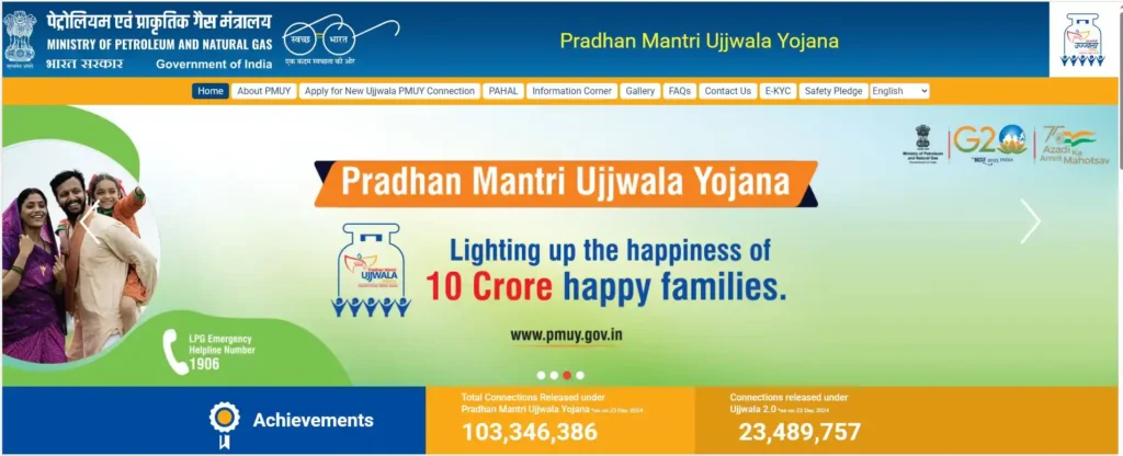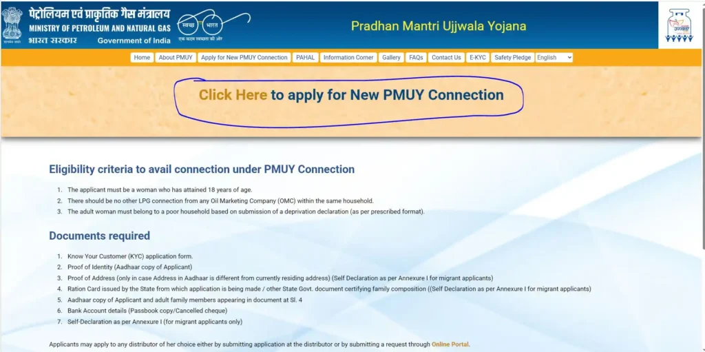 - वेबसाइट के होमपेज पर “Apply for New Ujjwala PMUY Connection” विकल्प खोजें और उस पर क्लिक करें।