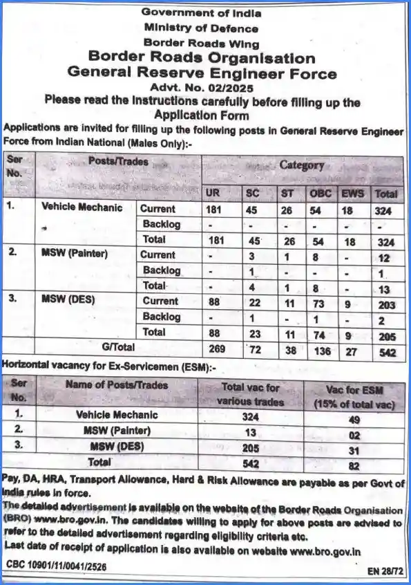 BRO Various Post Vacancy 2025 अगर आप 10वीं कक्षा पास की है और सरकारी नौकरी की तलाश में हैं, तो Border Roads Organisation (BRO) आपके लिए बहुत शानदार मौका लेकर आया है। BRO ने Vehicle Mechanic, MSW (Painter, DES) सहित कुल 542 विभिन्न पदों के लिए भर्ती का नोटिफिकेशन जारी कर दिया है। इच्छुक उम्मीदवार 11 अक्टूबर 2025 से 24 नवंबर 2025 तक ऑनलाइन आवेदन कर सकते हैं।