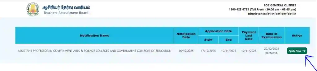 नए पेज पर ‘ASSISTANT PROFESSOR IN GOVERNMENT ARTS & SCIENCE COLLEGES AND GOVERNMENT COLLEGES OF EDUCATION’ के आगे “Apply Now” बटन मिलेगा। इसे सेलेक्ट करें।