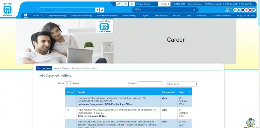 - अब “Career” सेक्शन में जाएं और Advt. No. HO/HRM/RECR/2025-26/COM-03 (Engagement of Apprentices in UCO Bank for FY 2025-26) के सामने दिए “Click Here to Apply Online” ऑप्शन पर क्लिक करें।