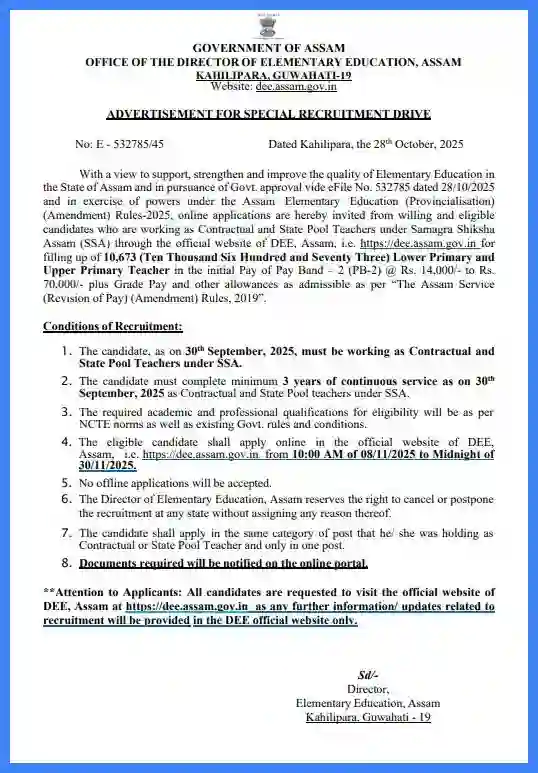 | DEE Assam Teacher Recruitment 2025 | Apply Link Active On 8 November 2025 |