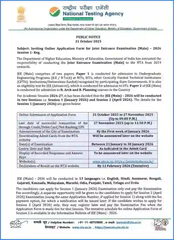 JEE Main 2026 अगर आपने 12वीं पास कर ली है और देश के प्रतिष्ठित IIT, NIT या अन्य प्रमुख इंजीनियरिंग संस्थानों में दाखिले का सपना देख रहे हैं, तो आपकी प्रतीक्षा अब खत्म होने वाली है! नेशनल टेस्टिंग एजेंसी (NTA) ने JEE Main 2026 के लिए आधिकारिक नोटिफिकेशन जारी कर दिया है। इच्छुक अभ्यर्थी 31 अक्टूबर 2025 से 07 नवंबर 2025 तक ऑनलाइन आवेदन कर सकते हैं।