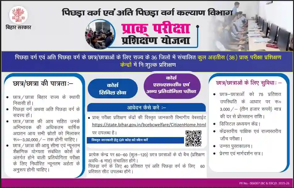 यह BC/EBC छात्रों के लिए बिहार सरकार की फ्री कोचिंग योजना है, जिसमें प्रतियोगी परीक्षाओं की तैयारी के साथ 75% उपस्थिति पर ₹3,000 प्रतिमाह प्रोत्साहन राशि दी जाती है।