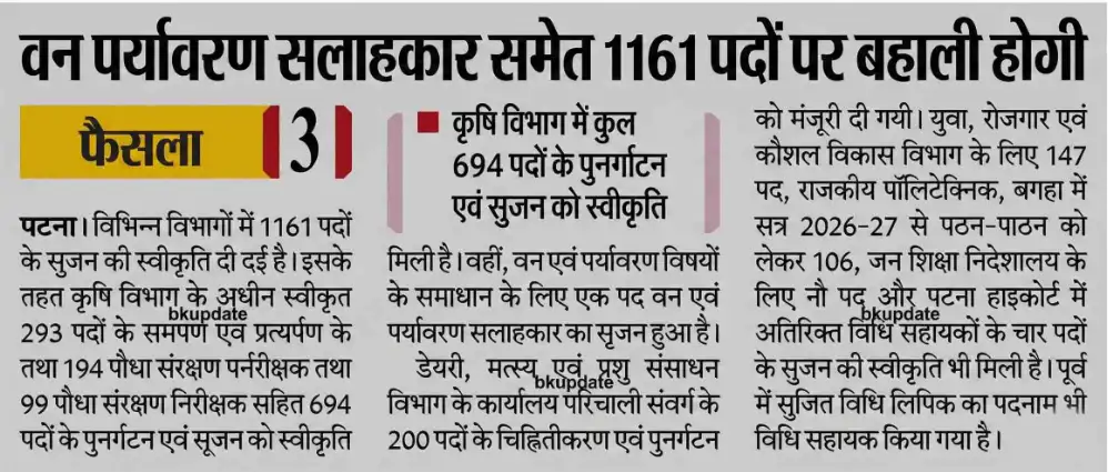 उत्तर: Bihar Recruitment 2026 में कुल 1161 पद स्वीकृत हुए हैं, जिनमें पौधा संरक्षण पर्यवेक्षक (694), कार्यालय परिचारी (200), युवा विभाग (147) और अन्य विभागीय पद शामिल हैं।