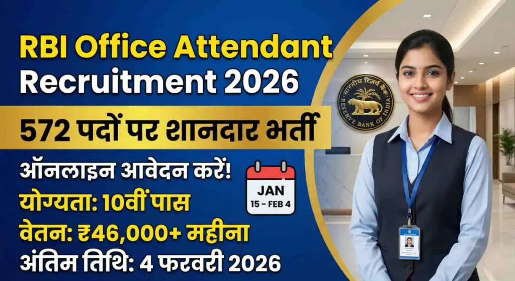 RBI Office Attendant Recruitment 2026 भारतीय रिज़र्व बैंक (RBI) ने उम्मीदवारों के लिए एक शानदार अवसर जारी किया है। यह भर्ती ऑफिस अटेंडेंट के पदों के लिए निकाली गई है। इस पद के लिए ऑनलाइन आवेदन प्रक्रिया शुरू हो चुकी है, जिसकी विस्तृत जानकारी आधिकारिक नोटिस में दी गई है।