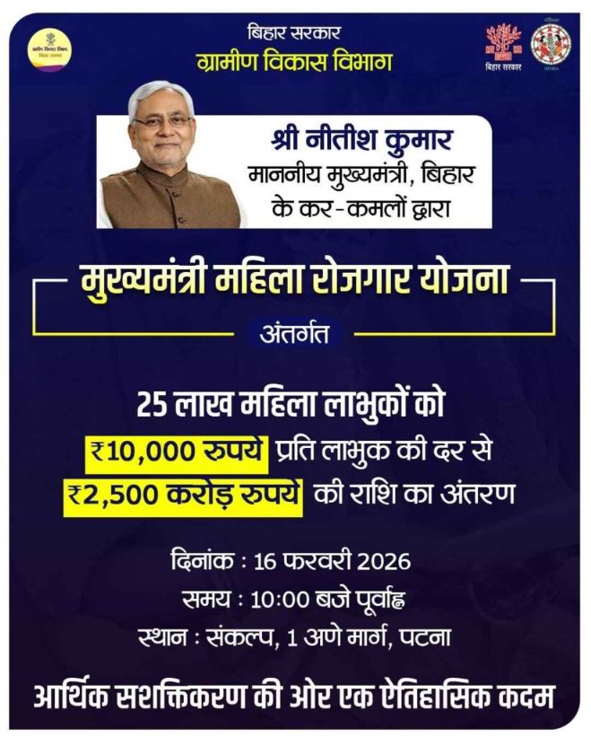 यदि आप बिहार राज्य की महिला हैं और रोजगार या स्वरोजगार शुरू करने की सोच रही हैं, तो यह योजना आपके लिए एक शानदार अवसर है। सरकार द्वारा जारी नवीनतम अपडेट के अनुसार, 16 फरवरी 2026 से लाखों महिलाओं के खातों में ₹10,000 की राशि ट्रांसफर की जा चुकी है, जिसे आप mmry.brlps.in वेबसाइट पर जाकर आसानी से चेक कर सकती हैं।