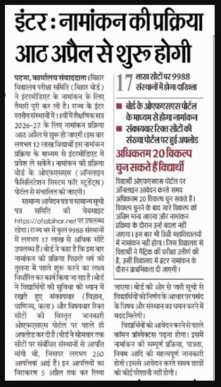 बिहार बोर्ड द्वारा इंटरमीडिएट नामांकन 2026 को लेकर नई जानकारी सामने आई है। अगर आप भी 11वीं कक्षा में दाखिला लेना चाहते हैं, तो यह अपडेट आपके लिए बेहद जरूरी है।